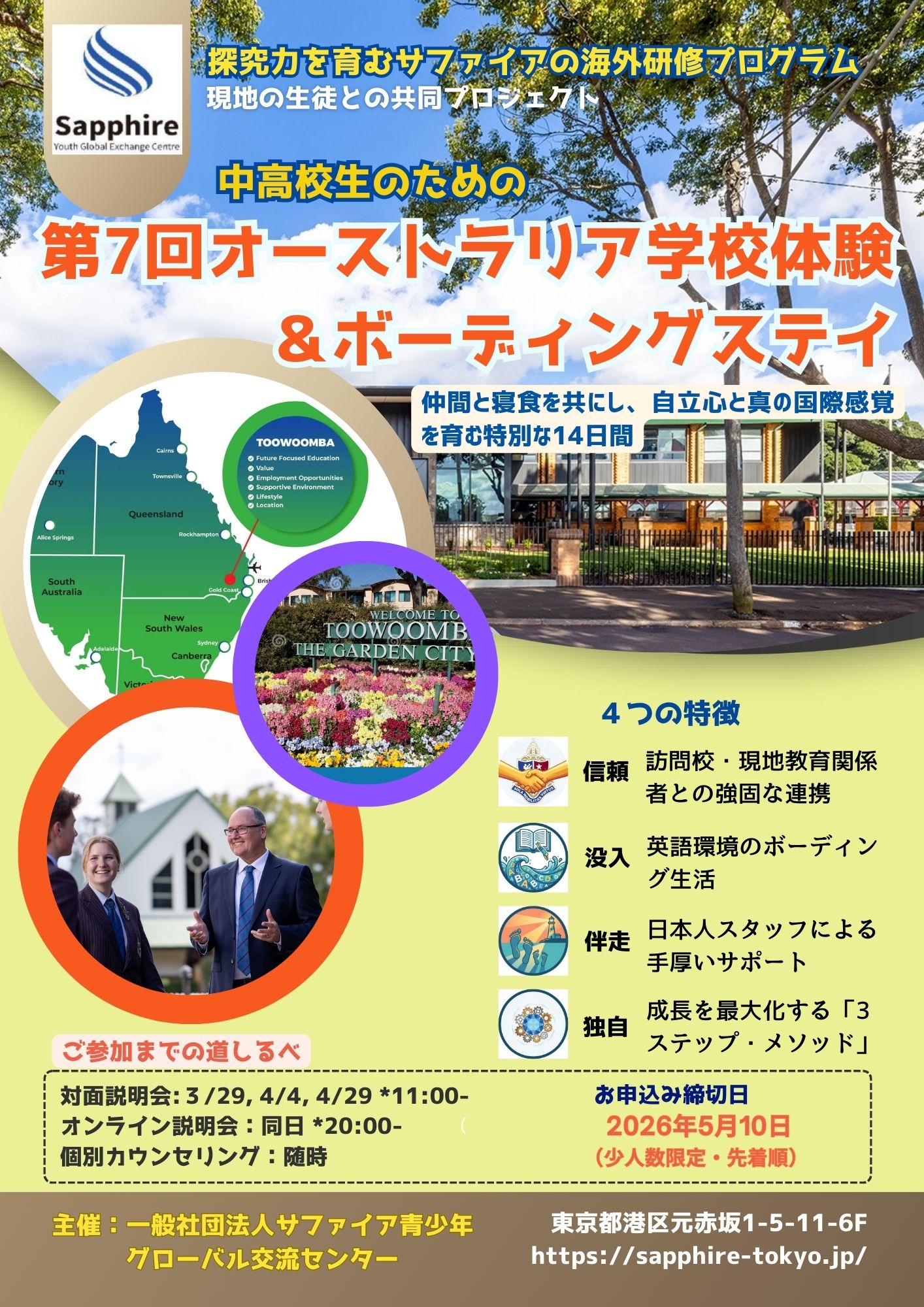 最新情報 【新着】2026年度夏季オーストラリア研修のご案内(準備中) 投稿日:2026年1月23日 2026年度夏季オーストラリア研修のプログラム日程・内容・旅行代金等は、2月15日頃の発表を予定しています。 今年は初めてボーディング(寄宿生活)制度のある学校体験プログラムです。 トップページに戻る Twitter Facebook Google+ Pocket B!はてブ LINE