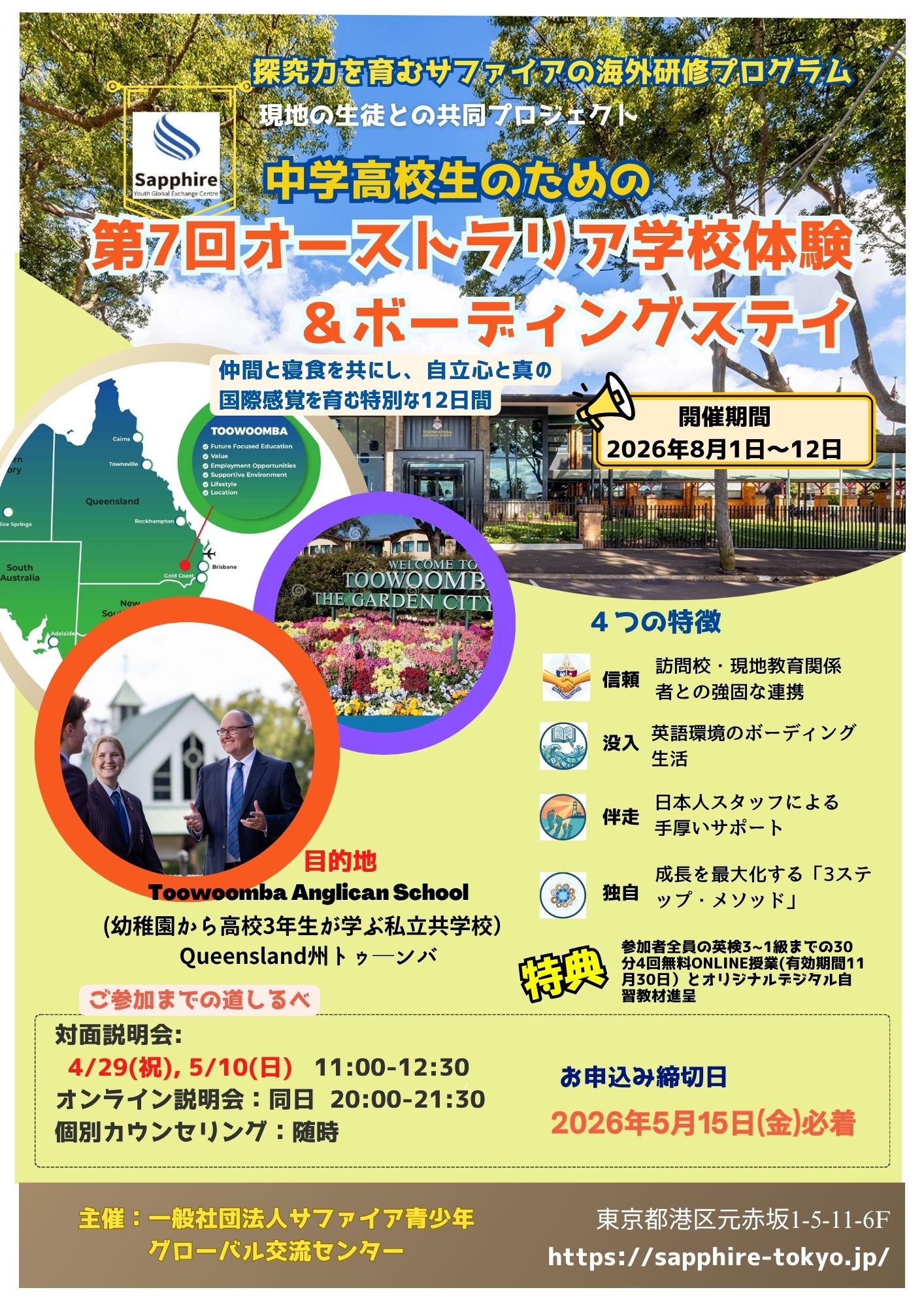 サファイアの海外研修プログラムは、訪問校を確定させて皆さまにご提案する点で、一般の中学校・高等学校で行われている語学研修や「交換留学」と同じだとお考え下さい。