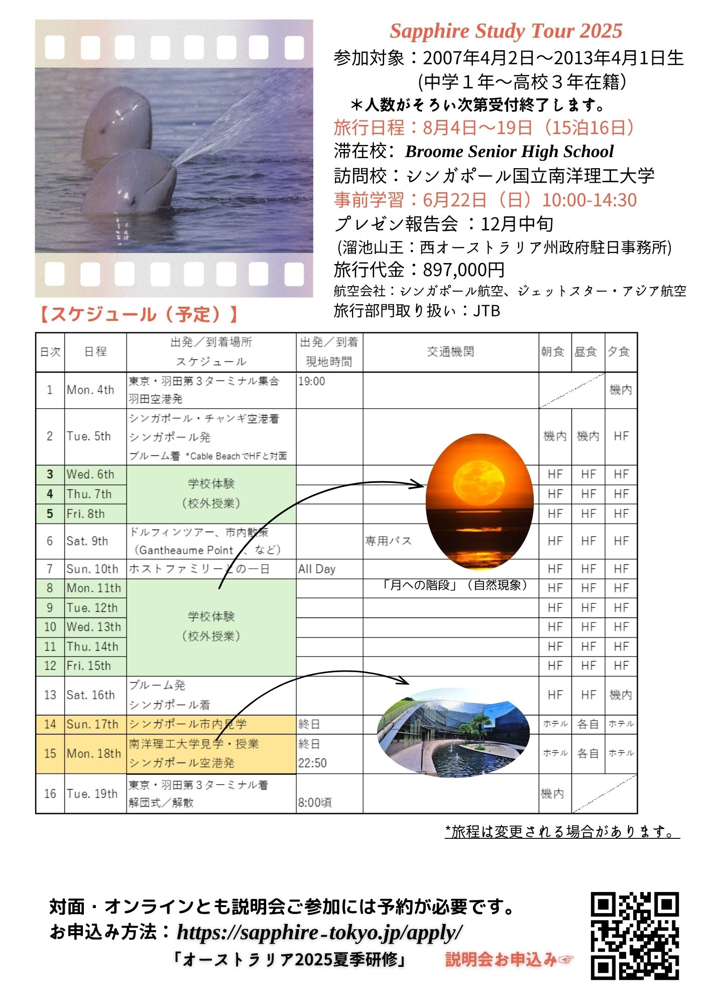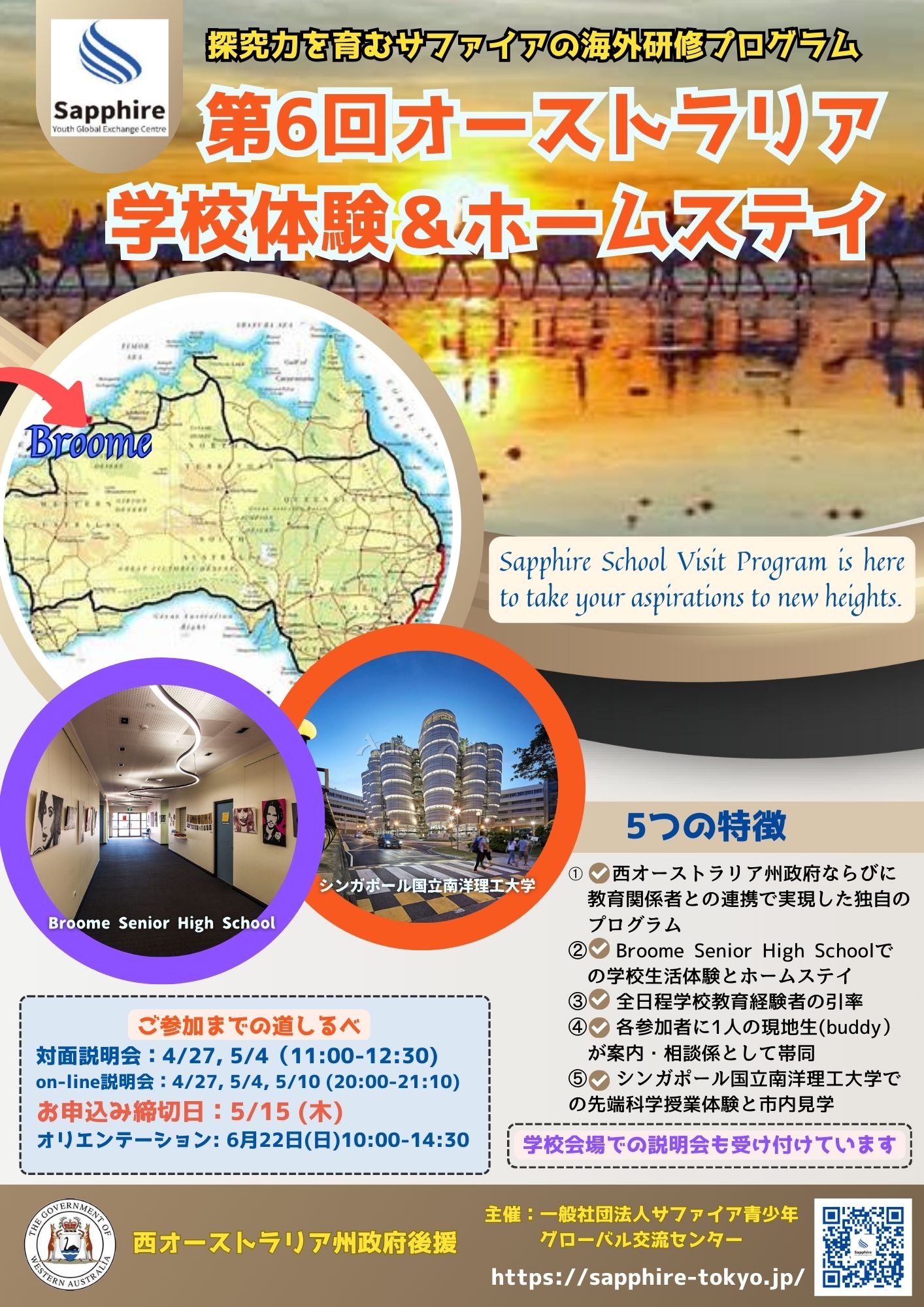 - サファイアの海外研修プログラムは、訪問校を確定させ、皆さまにご提案する点で、一般の中学・高校で行われている語学研修や「交換留学」と同じだとお考え下さい。今回の訪問先は西オーストラリア州(以後WA)・ブルーム(Broome)とシンガポールです。